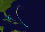 The first tropical cyclone and hurricane of the 1861 season is believed to have formed on July 6, immediately east of the Leeward Islands. A 1938 publication documented the storm's effects on Guadeloupe and St. Kitts, and given a lack of prior reports on the cyclone, modern-day reassessments concluded that it was relatively weak when it affected those islands.[5] After crossing the northern Leeward Islands, the tropical storm broadly curved toward the northwest, likely intensifying into the equivalence of a Category 1 hurricane on the Saffir-Simpson Hurricane Scale on July 9.[2] The majority of the storm's track in the western Atlantic was unknown until it was reconstructed based on reports from, and the effects on, three ships in its vicinity.[5]