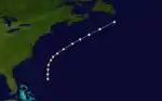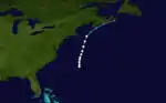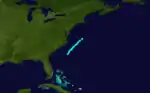 A modern-day Category 1 hurricane was first seen on October 14 approximately 310 miles (500 km) west of Bermuda.[4] A schooner, Albert Treat, encountered the storm and was thrown onto its beam ends. The schooner suffered considerable damage and three men drowned.[5] The next day, further north, the barque Acacia fell onto its beam ends, but managed to reach safety. Throughout October 16 the hurricane traveled northward, parallel to the East Coast of the United States. The ship Oder reported losing its sails in a hurricane off Sable Island that day. The Confederate cruiser Alabama lost its main yard and several sails, torn to shreds in the wind, and had two boats smashed.[6] The storm became extratropical around midday on October 16 and dissipated completely by October 17.[3]