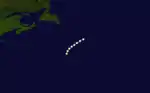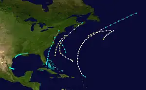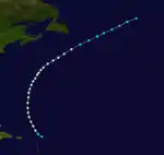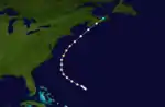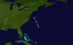 A tropical storm was initially encountered near the Lesser Antilles on September 9 by the ship Frank W.. Later that day, the ship Mary Ann was dismasted.[3] It is estimated that the cyclone intensified into a Category 1 hurricane around 12:00 UTC on September 9, with winds reaching 80 mph (130 km/h). The system moved north-northwestward or northward for several days and closely approached Bermuda late on September 11.[5] Around that time, some ships to the southeast of the island were damaged during the storm and put into Bermuda as a result.[3] By early on September 13, the hurricane was beginning to move in a more northeasterly direction.[5] The bark Machae was dismasted on September 14.[3] The cyclone weakened to a tropical storm early the following day.[5] On September 16, the Glad Tiding last observed the storm about halfway between Newfoundland and Ireland.[3]
