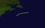 A Category 2 hurricane was first encountered by the ship Francis B. Cutting about 630 mi (1,010 km) south-southeast of Cape Race, Newfoundland, on August 8.[3][5] With winds estimated at 105 mph (165 km/h), the storm weakened to a Category 1 hurricane several hours later as it tracked northeastward. The cyclone was last noted late on August 9.[5]
