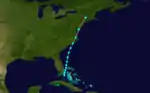 A tropical storm formed near South Florida on September 16. Later that day, the sloop Eliza was dismantled at Matanilla Reef, about 50 mi (80 km) north of Grand Bahama.[3] Moving north-northeastward, the storm began approaching the Carolinas on September 17. The cyclone intensified and peaked with winds of 70 mph (110 km/h) that same day. Around 13:00 UTC on September 18, the system made landfall in Emerald Isle, North Carolina. Thereafter, the storm tracked rapidly north-northeastward and lost tropical characteristics near the Connecticut–Massachusetts–New York state lines early on September 19.[5]
