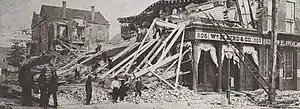 Within the city, many of the buildings sustained damage; some had to be torn down and rebuilt. The most prominent damage was done to buildings constructed out of brick, amounting to 81% of building damage. Buildings that had a wood frame suffered significantly less damage. Another factor that affected the percent of buildings destroyed was what kind of ground these buildings were built on. Buildings constructed on made ground were significantly more likely to be damaged than buildings constructed on solid ground; however, this relationship only occurred in wood-frame buildings, with 14% of wood-frame buildings built on made ground sustaining damage, compared to 0.5% of wood-frame buildings built on solid ground sustaining damage. This relationship was negligible as it pertains to the damage of buildings made of brick.[8]