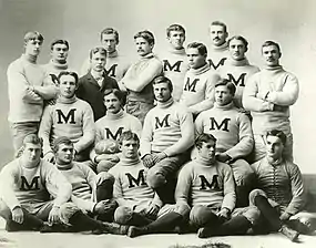 In April 1892, an athletic league, to include football, baseball, and track, was formed at Chicago between Michigan, the University of Wisconsin, the University of Minnesota, and Northwestern University. "The plans of the league are to have a series of base ball games in the spring, an inter-collegiate field day to be held in Chicago in June and a series of foot-ball games in the fall."[36] The new athletic league, named the Western Intercollegiate Athletic Association, was later renamed the Big Ten Conference.[37]