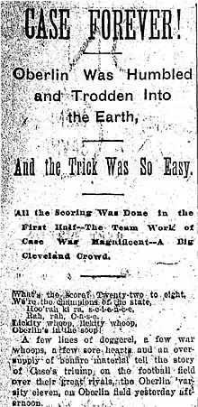 Case snapped a 13-game win streak of Oberlin, whose win streak dated back to their undefeated 1892 season. Notably, Case defeated Coach John Heisman of Buchtel, handing him his first ever career coaching loss, who ironically was the coach of the undefeated 1892 Oberlin team the prior season.