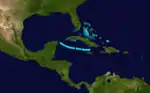 According to reanalysis by José Fernández Partagás in 1996, this system may have formed as early as June 4. However, Partagás elected to retain Simón Sarasola's 1928 narrative on this cyclone, indicating development about halfway between Cuba and Jamaica early on June 6.[1] The cyclone remained weak, peaking with maximum sustained winds of 40 mph (65 km/h) as it headed generally west-northwestward. Late on June 9, the storm was last noted near northeastern tip of the Yucatán Peninsula.[2] Flooding occurred in Cuba between Havana and Oriente Province, with the worst impacts in Santa Clara.[1]