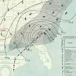 On September 18 a tropical storm was first observed and lasted until September 30. It formed to the east-southeast of the Lesser Antilles. It hit the Lesser Antilles and then the Greater Antilles, later curving north and striking near Punta Rassa, Florida, with winds up to 105 mph (169 km/h). It then went back out to sea and hit South Carolina, tracked through North Carolina, and then made its way out to sea, where it eventually dissipated. On September 20, as the storm passed through the Lesser Antilles, it produced heavy rains and high winds over several islands. On Martinique, high winds and continuous, torrential rains impacted the island. Despite the intensity of the storm, there were no reports of damage in the Lesser Antilles. In Hispaniola, more than 500 homes and two churches were destroyed; numerous other structures sustained damage, mainly having their roofs blown off. The cyclone produced heavy rainfall in Florida, including 13.78 inches (350.01 mm) over a 54-hour period at Tampa; at Titusville, 7.72 inches (196.09 mm) fell in two days. Jacksonville registered a storm total of 11.11 inches (282.19 mm).[6] In southeast Florida, a bridge on the Lake Worth Lagoon was swept away[7] and thousands of dead fish beached at Jupiter,[8] but otherwise only gale-force winds and occurred and damage was insignificant.[9] The ship Jella was stranded at Hillsboro Inlet and the Emily II sank off Key West with a loss of all her crew. Many wine caskets and other debris were found on the beaches between the New River and the Lake Worth Lagoon.[10] In all, the cyclone was responsible for an estimated 200 deaths.