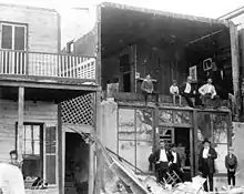 A residence building under construction at the Catholic University of America was dismantled, and the personal home of President Grover Cleveland in Woodley Park lost its roof. Roofs of several government offices were also torn away, and the steeple of New York Avenue Presbyterian Church was "reduced to match wood".[78] The Smithsonian Institution Building sustained notable damage.[79] Fallen trees littered the grounds of the White House,[76] among them being historic specimens like an elm planted by Abraham Lincoln.[20] Some of the more celebrated trees were picked apart by passersby trying to procure souvenirs.[76] The White House itself suffered some minor damage, mostly limited to dislodged coping and copper roofing,[20][71] along with a few broken windows.[28] Nearby, five men were entrapped and one killed when the Abert Building—a newly built, five-story brick structure on Pennsylvania Avenue—partially collapsed in the storm, crushing two adjoining buildings.[27][71] Over the coming months, tenants filed multiple lawsuits against the building's owner after at least one local builder asserted that the wall failure resulted from neglectful construction.[80][81][82] The Abert Building was completely repaired by October 14.[83]