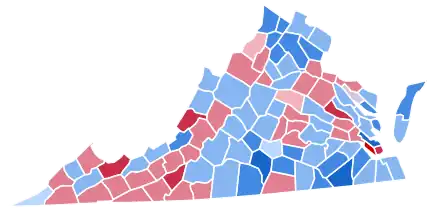 Virginia ultimately voted comfortably for Bryan over McKinley. Bryan won the state by a margin of 6.56 percentage points; however, McKinley did make major gains in developing Southwest Virginia, where he was the first-ever Republican victor in Botetourt, Buchanan, Carroll, Grayson, Greene, Pulaski, Shenandoah, Smyth and Washington Counties.[7] Aided by the developing shift to a “lily-white” Jim Crow state Republican Party,[1][2] this region and these counties would become the party’s stronghold in Virginia during the first half of the twentieth century, allowing the party to remain more viable than in any other ex-Confederate state other than North Carolina and Tennessee where extremely loyal Unionist Republicanism remained.[8]