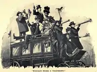 After the game, there was a parade down Woodward Avenue to the Russell House.[21] The Detroit Free Press described the celebration: "Canes were flourished; hats were thrown in air ...; pretty girls waved ribbons and flags of dual color, yellow and blue; trumpets sounded, bugles blew; horns screeched; horses neighed and pawed the ground, wondering, no doubt, what all this bother was about. Beneath the shouts and cries, like a deep bass accompaniment to the wonderful composition of sounds ran the low muttering of the multitude and the tramping of many feet. Michigan had won the contest and the jubilant feelings of her followers were but finding an outlet in the rhythmical yells, the lightsome sounding of tins and brasses, the short, hoarse cheers from the tired and husky throats that had already shouted all too long."[22]