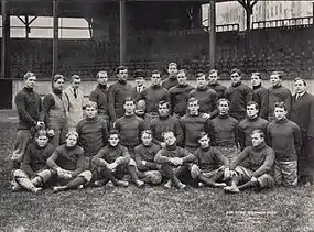 On February 9, 1907 the Western University of Pennsylvania Athletic Committee hired Yale graduate John A. Moorehead as head football coach for the 1907 season. Mr. Moorehead was originally hired as an assistant line coach on October 29, 1906.[11] Frank Rugh, former WUP player and 1904 Law School grad, was the assistant coach. When 1906 team captain Gil Miller became ill, Cal Marshall was appointed his replacement and did a commendable job. The team officially nominated him team captain for the 1907 season at the season ending banquet.[12] The Athletic Committee also hired Ed LaForce, the well known trainer of the Pittsburgh Pirates, for the 1907 football season.[13] The team lived in a new training house that was built next to campus. The prospects for a successful season were good as end Theodore Perry was the only starter who had graduated. Plus, the Athletic Committee reviewed the eligibility rules and determined that graduate students Jud Schmidt and Joe Edgar could play another season. The same committee then disqualified both players on November 4 for undisclosed reasons.[14] The committee put together a competitive ten game schedule. In its first season under head coach John A. Moorehead, the team compiled an 8–2 record, shut out eight of its ten opponents, and outscored all opponents by a total of 147 to 27.[15][16]