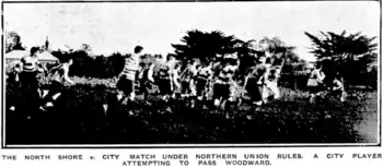 A further meeting was held at North Shore on the Wednesday evening at the Council Chambers in Devonport with 40 in attendance, and a club was formed. It was noted that they had the playing numbers for two teams and they had "taken the pick of the amateur players of the district club". The club would be called North Shore Albions. On the Thursday night a preliminary meeting was held in the city with 20 players attending with the goal of forming a club that was either a city team or a combination of a city and Ponsonby team, while a Newton club was also aimed to be formed the following week as there was "considerable dissatisfaction among the members at the management of the Auckland Union".[4] It was decided to play a match on the Saturday between the North Shore team and the city team. The match was duly played between North Shore and City and resulted in a win to the former by 44 points to 22.[5]