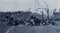 Michigan lost an excellent scoring opportunity in the second half. The Wolverines recovered a fumble at Notre Dame's 15-yard line and drove the ball to the six-yard line. With one yard to go for a first down, and "to the utter astonishment of nearly everyone present who knew enough about football", Wasmund called on Allerdice to kick a field goal rather than trying for the one remaining yard needed for a first down.[35] The snap from center was poor, and by the time Allerdice kicked the ball, it hit a Notre Dame lineman in the chest and rolled to the 40-yard line where Notre Dame recovered. Wasmund's decision to call for the field goal was widely criticized as a "blunder", "silly", and "an atrocious error of judgment" that cost Michigan the game.[35][36] On the sidelines, Walter Camp and Fielding Yost "expressed their disapproval in the most decisive terms."[35]