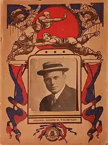 "The remarkable success attained by the representatives of the University of Pittsburgh on the athletic field during the year of 1910 marks the high–tide of athletic activity at this institution. Until a few years ago athletics in Pittsburgh were unorganized and the teams were unworthy to represent an institution of higher learning....In 1904 a number of enthusiastic Alumni took up the General Athletic Committee and arranged for a foot-ball coach and training table, and a schedule that put Pitt on the athletic map. Since that time the organization has been perfect, the student enthusiasm has been enlisted, and steady progress the result. The latest improvement has been the installation of the graduate coaching system. Joseph H. Thompson has proved to be the right man in the right place, as championships in foot-ball and track go to prove. Joe has developed a "Pitt system," one that will place the University of Pittsburgh among the great names in intercollegiate sports."[16]