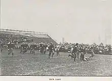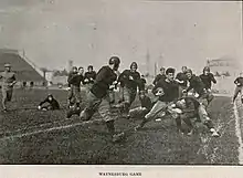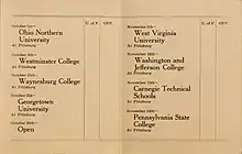 After Coach Joe Thompson led the Pitt eleven to a surprising 6–2–1 record in 1909 with only four returning players, the Pitt Athletic Association, students, faculty and fans were looking forward to another successful season in 1910. Captain Homer Roe and Frank Van Doren were the only losses to graduation. All the returning players already knew the Coach Thompson system. The schedule that Graduate Manager Hurst assembled was weaker than previous years as Carlisle, Notre Dame and Bucknell were missing. Georgetown, Carnegie Tech and Ohio University were the replacements and Pitt had no away games. Significant games played by Pitt during the 1910 season included victories over West Virginia (38–0), Washington & Jefferson (14–0), and Penn State (11–0).[11] The first two games were played at D.C. & A.C. Park and the final seven at Forbes Field. The football game programs for this season were "The First Annual Football Yearbook" put out by the University of Pittsburgh Athletic Committee. For ten cents one received seventy-two pages of Pitt sports history.[12] The covers were photos of prominent University officials: Chancellor Samuel Black McCormick (Washington & Jefferson game), Dr. Albert Frost, Dean of the Faculty of the College and Engineering School (West Virginia game ), and Coach Thompson (Penn State game).[13] The University would continue the Yearbook style program through the 1926 season. The Pitt Weekly school newspaper debuted on September 26, 1910 and covered the football season in depth. The results of the season were much better than anyone had anticipated. Pittsburgh shut out all nine of its opponents, outscored opponents by a combined score of 282 to 0, and finished with a perfect 9–0 record in their second year under head coach Joseph H. Thompson.[11][14]