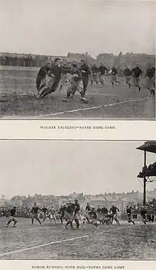 "I just had opportunities and few players overlook them on the gridiron." This statement was made by Hube Wagner. Pitt's star left end, who yesterday played the greatest individual game that has ever been seen on Forbes Field, although he and his teammates were defeated by their time honored rivals-Penn State, 3–0. Wagner may have taken advantage of the opportunities that came his way yesterday, but it is the consensus of opinion that most of these were made by the star end and then taken hold of...Defensively, in one period of the game he made seven consecutive tackles...During the last few seconds of the third quarter, Wagner electrified the crowd when he intercepted a State forward pass on his own 35-yard line and after eluding several opposing tacklers ran to State's 36-yard mark before being brought down by Very."[50]