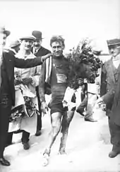 The crucial stage proved to be the sixth. At the start of the sixth stage, last year's winner Defraye led the general classification, some 5 minutes ahead of Eugène Christophe.[3] In that sixth stage, the first mountains were climbed. Defraye was dropped quickly, and Christophe led the race.[8] Christophe came up first on the Aubisque, and in second place behind Philippe Thys on the Tourmalet. On the way down from the Tourmalet, Christophe was hit by a race vehicle,[11] and his fork broke, rendering his bike unusable, and the rules said that he had to repair it himself. He walked more than 10 km down to the next village, and found a place where he could repair his bicycle. He worked on it for over three hours, being watched by race officials who made sure that he was not helped by anyone. When Christophe asked a small boy, of seven years old, to work the bellows, he was fined with ten minutes.[8][12] During this repair, angry with the draconian rules, he snapped: (at the hungry race commissaires) "If you're hungry, eat charcoal! [...] I am your prisoner and you will remain my wardens till the end".[13] After his bicycle was fixed, he rode away and finished the stage, 3 hours and 50 minutes later than the stage winner Thys. Christophe's chances to win the 1913 Tour de France were over.[14]