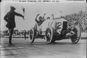 Race-day was hot and fine, and about 300,000 spectators lined the roads.[9] The cars started the 20-lap race in pairs in numerical order, at 30-second intervals. First away were Szisz and Jörns,[20][21] but Boillot was the first to arrive back at the finish-line. However, Sailer was ahead on elapsed-time and from the beginning he forced the pace, drawing Boillot into a speed-contest to try and break the Peugeot.[9][20] On the sixth lap though his Mercedes stopped with engine problems letting Boillot take over the lead. By the 11th lap, just after the halfway mark, Wagner had passed Goux then Lautenschlager to move into second.[18] Szisz had pulled over to replace a wheel, when he was struck by an Opel, that broke his arm.[22][23]