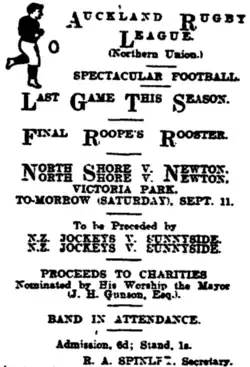 A trophy which is still played for today saw its beginnings in the 1915 season. Namely the Roope Rooster trophy which was donated by Mr. Pauntley Whittington (Dick) Roope. It was a knockout competition with one round of matches before semi-finals were played.[7] With the semi-final between Newton and Grafton being drawn (after North Shore received the bye) the management committee decided rather than replaying a match between the same teams there would be more interest in a match between Grafton and North Shore, with Newton progressing to the final. The second semi-final was played at Victoria Park and saw both teams wearing white armbands in memory of 3 men killed in action at the Dardanelles who had played club rugby league in Auckland (Charles Savory from Ponsonby United, Charles James Hally from Otahuhu, and William Moeki from City Rovers).[8] A charge was made for the semi-final between North Shore and Grafton with the proceeds going to the Door of Hope, the Salvation Army Maternity and Rescue Homes, Sister Esther's Relief Work, and the St John Ambulance Brigade. The final was played on 11 September at Victoria Park between North Shore Albions and Newton Rangers, with North Shore winning 10 points to 7.[9]