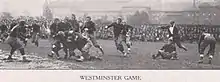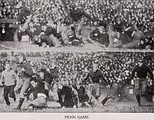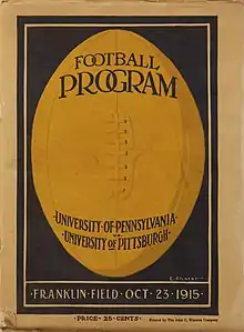 The January 8 edition of The Pitt Weekly noted: "The football card for 1915 is still somewhat up in the air. Negotiations with Penn for a date in Philadelphia or Pittsburgh next season have terminated in the refusal of the Red and Blue to tie up with the University, so that the October 23 date remains open. Penn has been in a rut for several seasons and presumably, .. couldn't see adding to their troubles by taking on Pitt."[15] Six days later The Pittsburgh Post reported a complete reversal: "The two big institutions of learning of the Keystone state, University of Pennsylvania and University of Pittsburgh, will meet next fall in football. The game will be played on Franklin Field, Philadelphia, October 23." The schedule only had eight games because Cornell refused to come to Pittsburgh and Pitt was not invited to Ithaca.[16] Pitt never played Cornell again.[17]