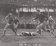 The 1915 Pittsburgh Pirates finished in fifth place so the Pitt eleven were able to play all their games at Forbes Field.[25] Special bleachers were installed for the students. "The Freshmen class being assigned to the right field cheering space will be given a cheer leader of their own, and will be worked to the limit to win the rooting decision over their upper class rivals (across the field in the left field section). Another feature, continuing a custom of many years at Pitt games, will be the wearing of numbers by both teams."[26]