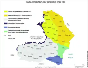 Romanian territories ceded to Austria-Hungary (purple), Bulgaria (blue), and the Central Powers (green) through the Treaty of Bucharest. Romanian territory under Central Powers' occupation depicted in grey