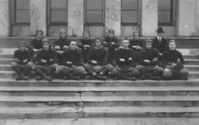 Last year no one imagined that a foot-ball team was within the possibilities of our college, because we hadn't the first requisite — men. This year we have men enough in school to organize a football team. The boys practiced faithfully and played some good games. One College sent their team here for a scheduled game. When they came they declined to play. Their reason was that the weather was too inclement, but it was not too bad for our boys to play and for our girls to gather en masse to help our boys win by their cheering. It was quite evident to us that the incoming team was scared. They did not expect to find well trained players. When they found men ready to win their ardor cooled and they went home without playing the game.[5]