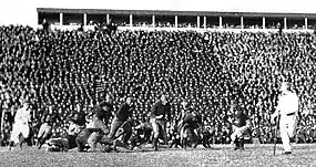 The game attracted between 45,000 and 50,000 spectators, setting a new record as "the greatest throng that ever jammed historic Ferry field."[22] The crowd included an estimated 15,000 Ohio State fans with thousands having driven to the game by automobile and thousands more in special trains from Columbus.[23] At least six airplanes were also employed to bring spectators to Ann Arbor, including two brothers flying to Ann Arbor from Denver and several Marines from Quantico, Virginia, flying in four airplanes to scout the Michigan team for the upcoming match against the Quantico Marines.[24] Tickets sold for prices as high as $50,[23] and 16 persons were jailed for ticket scalping.[25] The Michigan athletic department reported that 55,000 ticket applications had been denied, requiring "the entire time of four men for the past three weeks to return money for which tickets were not available."[26]