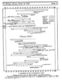 On October 13, 1923, Michigan defeated the Southern Conference co-champion Vanderbilt Commodores, 3–0, at Ferry Field.[10][11] Michigan's victory snapped a 20-game unbeaten streak for Vanderbilt that dated back to November 1920.[12] Vanderbilt was coached by Dan McGugin, who had played for Yost's Michigan teams in 1901 and 1902 and had been an assistant coach for Michigan in 1903. During McGugin's tenure at Vanderbilt, Michigan played nine games against the Commodores from 1905 to 1923, with Michigan winning eight games and playing to a tie in 1922.[13] Vanderbilt returned nine of eleven starters from its 1922 team that held Michigan scoreless in the prior year's game and was regarded as having as strong a team as it had in 1922.[10][14][15]