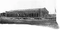 In May 1923, the University of Michigan's Board of Control of Athletics announced that the new field house under construction would be named after Fielding H. Yost, who had been Michigan's head football coach for 22 years.[4] At the time of its completion in the fall of 1923, Yost Field House was "the largest structure for competitive athletics in the world."[5] The structure was designed to have a seating capacity of 12,500, an indoor track with a 75-foot straightaway, basketball courts, indoor practice facilities for the football and baseball teams, locker and shower facilities for 4,200, athletic association offices, and trophy rooms.[4]