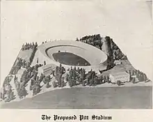 The Athletic Council announced in February that they secured property adjoining Trees Field for a probable stadium.[9] In August they announced that they would erect a modern stadium seating at least 60,000. “The engineering plans are complete...The ordinance vacating unused portions of three streets was introduced in city council ...with expectation that it will be passed promptly, and it is now stated that immediately on receipt of this assurance from the city fathers the contract for grading will be awarded and work commenced. It is planned to complete all grading this year, so that the field will be in readiness for the erection of the huge steel and concrete stands as soon as the weather breaks next spring. 'The Pitt schedule for 1924 is being planned to be played in the new stadium.' declares Manager Davis.”[10]