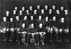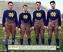 The 1924 Notre Dame Fighting Irish football team was an American football team that represented the University of Notre Dame as an independent during the 1924 college football season. In their seventh season under head coach Knute Rockne, the Fighting Irish compiled a perfect 10–0 record, defeated Stanford in the 1925 Rose Bowl, and outscored opponents by a total of 285 to 54.[1] The team was led by the legendary backfield known as the "Four Horsemen" consisting of quarterback Harry Stuhldreher, halfbacks Don Miller and Jim Crowley, and fullback Elmer Layden.