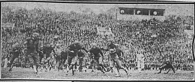 The starting lineup was Winslett (left end), Perry (left tackle), Jones (left guard), Holmes (center), Buckler (right guard), Camp (right tackle), T. Brown (right end), Hubert (quarterback), Caldwell (left halfback), Barnes (right halfback), M. Brown (fullback).[34]