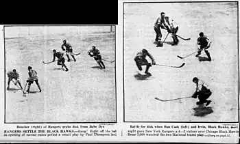 - Schreiber, Frank. "Blackhawks Win Hockey Opener 4–1". Chicago Daily Tribune. p. 19.