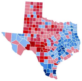 | Willacy | 389 | 49.55% | 396 | 50.45% | 0 | 0.00% | -7 | -0.89% | 785 |