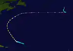 The first hurricane of the season was first noted in the central Atlantic Ocean on August 21. Slowly intensifying, the system initially moved towards the west.[2] On August 22, a steamship in the vicinity sustained some structural damage.[4] After attaining hurricane strength on August 24, the system turned northwestward, and reached Category 3 intensity on August 25 with maximum sustained winds of 125 mph (205 km/h) as it grazed Bermuda.[2] Recurving to the northeast, the French transatlantic ocean liner SS Paris encountered the hurricane while it was a Category 2 hurricane. A large wave struck the ship, shattering glass on the vessel and injuring 40 passengers.[5][4] Although still a Category 2 hurricane, the system became extratropical shortly after on August 28.[2] The extratropical storm was tracked due east towards the Azores for a few days while gradually weakening before abruptly turning to the north and dissipating.[4]
