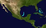 The final storm of the season developed in the Bay of Campeche on October 18 at the tail end of a frontal boundary. Although cool-air advection was occurring off the United States coast, warm air around the system allowed the tropical storm to intensify. Moving to the northeast, the system reached peak intensity as a high-end tropical storm with winds of 70 mph (110 km/h). Ultimately, the cool-air advection eventually took a toll on the storm, causing it to quickly weaken. By 06:00 UTC on October 21, the storm dissipated.[11]
