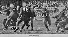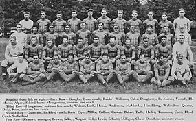 Jock Sutherland's coaching staff had to be restocked for the 1930 season. Charles W. Bowser, assistant coach in charge of the backfield, became head coach at Bowdoin College.[18] Alexander Stevenson, assistant Pitt coach and scout since 1909, contracted pneumonia upon his return from the Rose Bowl and died on February 5.[19] Andy Gustafson, former Pitt fullback, succeeded Charles Bowser as head backfield coach. He had been the head coach at Virginia Tech from 1926-29.[20] 1929 All-Americans Joe Donchess and Ray Montgomery were both hired by the athletic council to assist coach Sutherland for the 1930 season. Montgomery coached the varsity linemen and taught in the physical education department. Donchess was still in medical school and assisted team physician Dr. Shanor with physical conditioning of the players. He also helped coach the ends.[21] Bill Kern, former All-American Pitt tackle,[22] was added to the staff during spring practice. He coached the linemen.[23] The appointment of Ulhardt Hangartner, former Panther guard, completed the coaching staff. He was hired to assist the linemen and be in charge of scouting.[24]
