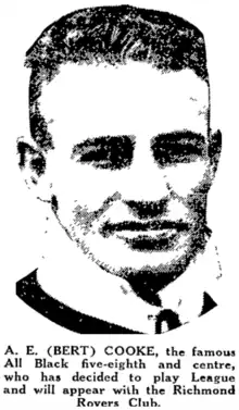 In the middle of the season the famous All Black Bert Cooke (rugby) switched codes when he moved back to Auckland. He signed with the Richmond Rovers.[19][20] The move proved very successful, so much so that he was selected for the North Island team in a trial match against the South Island only weeks after switching codes. He scored three tries and was selected for the New Zealand team to play England.