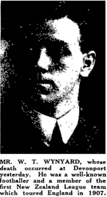 In August William Thomas Wynyard, aged 49 died. He was from a sporting family with three uncles who were part of the 1888–89 New Zealand Native football team that went on a rugby union tour of Great Britain. William played rugby union for North Shore and was an Auckland trialist before switching codes. He was a member of the New Zealand team which toured England in 1907–08 playing in 15 matches and scoring 4 tries.[22] He was then part of the inaugural Auckland rugby league competition in 1909 playing intermittently for North Shore Albions from 1909 to 1913, and representing Auckland in 5 matches from 1908 to 1910. He retired in 1913 but remained involved in the game for many years after.