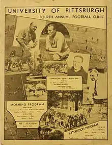 On May 11, Jock Sutherland held his Fourth Annual Football Clinic at Pitt Stadium for 1500 high school coaches and players. He was aided by head coaches Andy Kerr of Colgate and Dick Harlow of Harvard, in addition to his Pitt assistants and varsity team. The all-day affair consisted of a morning session with demonstrations and exhibitions of offensive and defensive tactics on the field, lunch with lectures by the visiting coaches, and an afternoon session back on the field.[17]