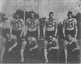 ![]() 1938 Ottawa backfield players. Top row, left to right: Jack Ramsey, Lyle Swetnam, Roy Fitzpatrick, Don Meek. Bottom row: Oliver Smith, Lyman Morgan, Lester Taylor, Norman Gerhold | |