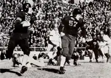The star player on the Boston College team was running back Lou Montgomery, who was the first Black student-athlete in B.C.'s history.[4] Sportswriters used adjectives like "flashy" and "brilliant" to describe his running ability and his skill at evading anyone trying to tackle him. He was an important part of B.C.'s successful season, and very popular with the fans.[5] But America was segregated at that time, and despite being a key part of the Eagles' offense, whenever B.C. played against southern teams, even if the game was played up north,[6] Montgomery had been benched.[7] And when Boston College received its invitation to the Cotton Bowl, the President of the Cotton Bowl's Athletic Association, Curtis Sanford, announced that Montgomery would not be allowed to participate, and that he had discussed this with "officials at Boston College," who agreed. Sanford asserted that keeping him out of the game was "advisable...in view of the general Texas attitude regarding Negroes."[8] The story was reported as if Montgomery too agreed with the decision, although some fans believed he felt there was no other option but to accept it.[9] Montgomery was praised in the major Boston newspapers for being such a good sport about not playing in the Cotton Bowl.[10] Years later, some Boston sportswriters had second thoughts, and wondered why they hadn't protested the injustice of a star player being excluded from a bowl game because of his race, but at the time, few of the white sportswriters spoke up.[11] Sportswriters at Black newspapers were outraged over it, however. One Boston-based reporter for the Chicago Defender accused coach Frank Leahy of giving in to Jim Crow customs and "catering to southern prejudice," charges that Leahy denied.[12] Other Black sportswriters accused Boston College, a Catholic institution, of not living up to its own ideals, by allowing Montgomery to endure discrimination and doing nothing to defend him.[13] In mid-January 1940, the Boston Veterans of Foreign Wars gave Montgomery an award for "sportsmanship, citizenship, and athletic ability," and praised him for his "self-effacement."[14]