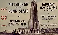 The final game on the schedule of this war-time season was against Penn State. Pitt led the all-time series 24–16–2, but the Lions had won the last two games and three of the past four games.[59] Penn State was one of two schools that had the Army, Navy and Air Force Training Programs on campus. Coach Bob Higgins had 600 trainees report for try-outs. His main problem was who would be available at game time. Oddly, Bill Abromitis was the starting halfback for the Lions. The first four weeks of the season Bill was the starting fullback for the Panthers, and then he joined the Navy.[60] The Lions were 4–3–1 for the season.[61]