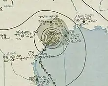 Damage from the hurricane throughout Florida was relatively minor. Citrus trees were stripped of their branches, roadways were washed out, and some telephone and power lines were toppled, temporarily severing communication.[5] Tampa recorded a record 24-hour rainfall total of 10.42 in (265 mm),[3] while precipitation peaked at 13.6 in (350 mm) in Lake Alfred.[6] Statewide, the heavy precipitation was regarded as beneficial in ending one of the worst recorded droughts there.[3] Two tornadoes were spawned; one blew a transformer off a platform and ripped a section of railing off a causeway, while both damaged some homes. Total damage reached $75,000 throughout Miami.[7] Farther north, telephone communications around Georgetown, South Carolina were disrupted, while winds gusted as high as 69 mph (111 km/h) and rainfall peaked at 5.58 in (142 mm) in Charleston.[8] In Wilmington, North Carolina, 8.24 in (209 mm) of rain was observed, causing considerable damage to the city's storm sewer system.[9] Although the core of the cyclone passed east of New England, at least 10,000 telephone lines were downed by the storm. Buildings, crops, and trees were damaged, while low visibility led to a traffic accident that killed a man in Warwick, Rhode Island.[10]