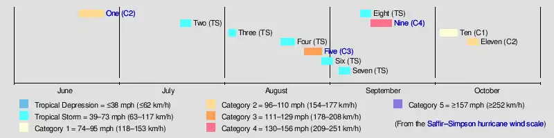 | Five | August 24 – 29 | Category 3 hurricane | 115 (185) | 963 | Texas, Florida | $20.1 million | 3 | |||