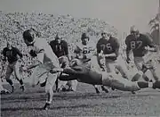 The 1947 Michigan Wolverines included five players who have been inducted into the College or Pro Football Halls of Fame: left halfback Bob Chappuis (who finished second in the 1947 Heisman Trophy voting), right halfback Bump Elliott (who received the Chicago Tribune trophy as the Big Ten MVP), defensive quarterback Pete Elliott, defensive end Len Ford, and tackle Al Wistert. Offensive tackle Bruce Hilkene was the team captain, and quarterback Howard Yerges was the field general who became known as "Crisler's 'second brain.'"[3] Jack Weisenburger was the "spinning fullback" and the 1947 Big Ten rushing leader.