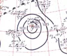 On September 25, a westward moving tropical wave near the Lesser Antilles began appearing in historical weather map. A reconnaissance aircraft flight into the system when it was over the central Caribbean Sea indicated wind gusts up to 52 mph (84 km/h), but no circulation. During a separate fight on September 29, it was noted that, "[a] complete search of area shows well-organized circle of storm but open to west and northwest". Although no circulation was detected, westerly winds were reported, making it likely that a tropical depression developed that day over the western Caribbean. Subsequently, the depression moved over the northern Yucatán Peninsula, which may have disrupted the poorly-defined circulation. By October 1, the system entered the Gulf of Mexico, where it began degenerating into an open trough on October 3. Cold air and the development of Hurricane Fox in the western Caribbean prevented re-generation. The remnants continued northeastward into North Florida and deepened while producing strong gales along the coasts of North Carolina and Virginia. It is possible that the remnants lasted until October 8, when it was absorbed by Fox.[18]