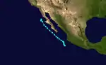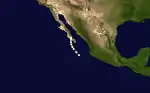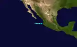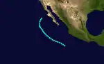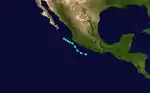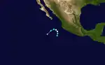 After no tropical cyclone activity in July and August, the third tropical storm formed offshore of southwestern Mexico on September 3. Like the previous two tropical cyclone, this storm had a peak of 50 mph (80 km/h), and did not intensify further. Tropical Storm Three headed northwestward, and began paralleling the coast of Baja California. On September 8, Tropical Storm Three turned abruptly south-southwestward, and dissipated by the next day.[5] The outer rainbands of this system were expected to bring squally weather over the Baja California Peninsula;[6] instead, this storm turned away without causing any impact.[7]