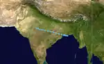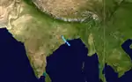 A ship reported thunderstorm rains in the southeast of Sri Lanka in April 4 while a shallow low was formed in the southeast Bay of Bengal on the next day, when Car Nicobar experienced overcast conditions and northeasterly winds. The low moved west and a well-marked trough formed southeast of Sri Lanka in the morning of April 7. By April 8, the trough developed into depression as winds of 15 to 20 knots are reported by number of vessels, and a vessel reported southerly winds The depression tracked north and then tracking northeast by April 10. By April 11, the system intensified and begins to accelerate towards Burma on evening of the same day.[4] In April 13, the system moved ashore across southern Rakhine State coasts and quickly dissipated over land.[5]