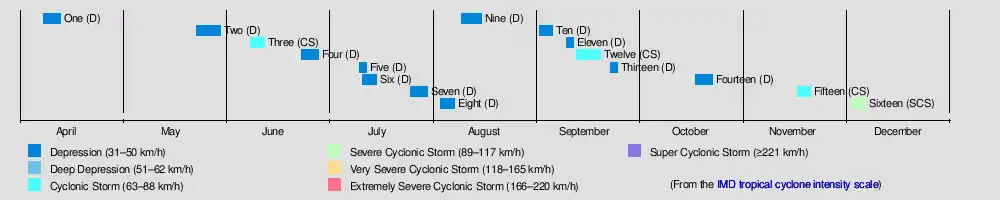 Sixteen depressions developed during the 1950 season, with four of them becoming cyclonic storms while three of them formed over the land. Most tropical cyclones formed in this season are weak, as there is no severe cyclonic storms formed during this season.[3]